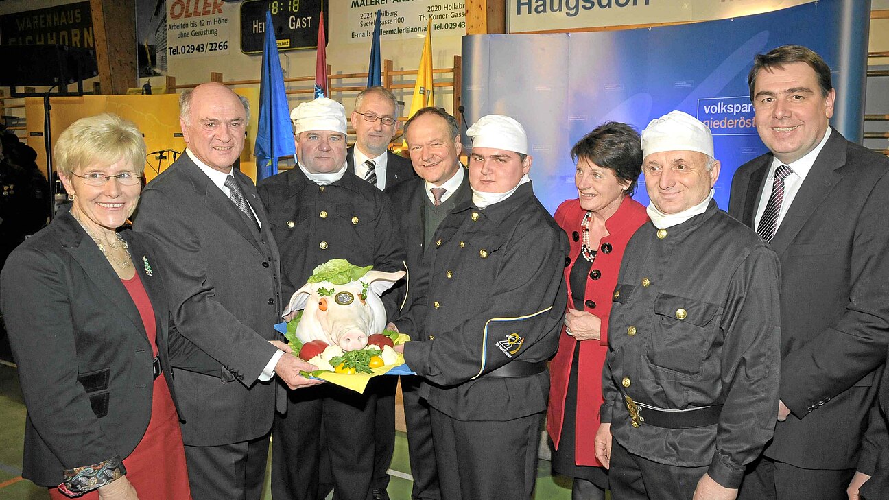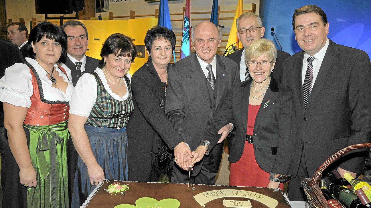 Nach den Ansprachen überreichten die Rauchfangkehrer dem Landeshauptmann einen „Sauschädel“ als Glücksbringer für 2012. Die Bürgermeister und GPO des Teilbezirkes dem Landeshauptmann eine Riesentorte. Beim anschließenden